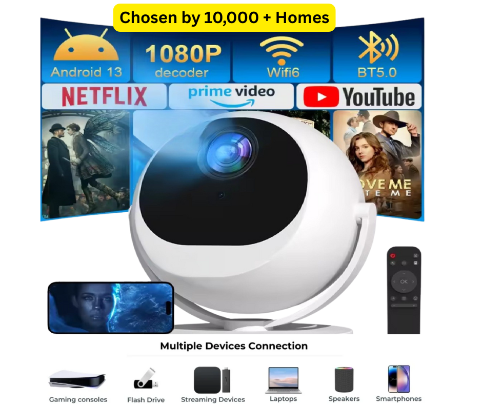 Instantly transform any wall or ceiling into a giant screen for movies, gaming or cosy ambience with LUMEOPRO CLEARCAST™. Experience ultra-bright 1080p projection anywhere, with dual-band Wi-Fi 6+, Hi-Res audio, and full 360° rotation for effortless viewing indoors or out.
